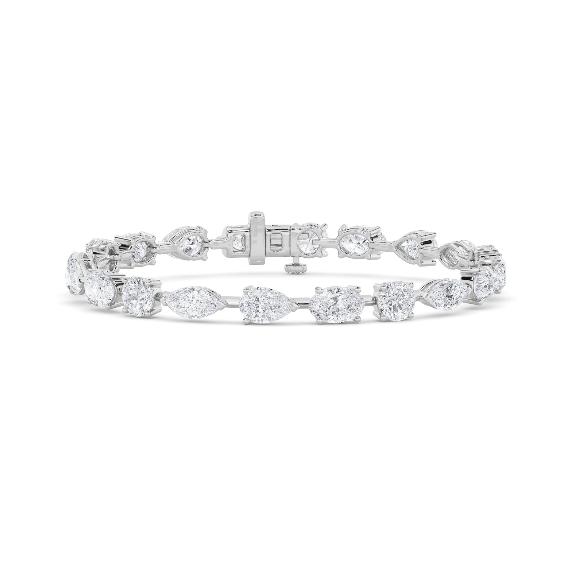 A considered arrangement of various diamond shapes for subtle variation and visual interest. Flexible construction offers ease of movement. Finished with a secure clasp for durability. Lab-grown diamonds selected for consistent cut, color, and clarity.